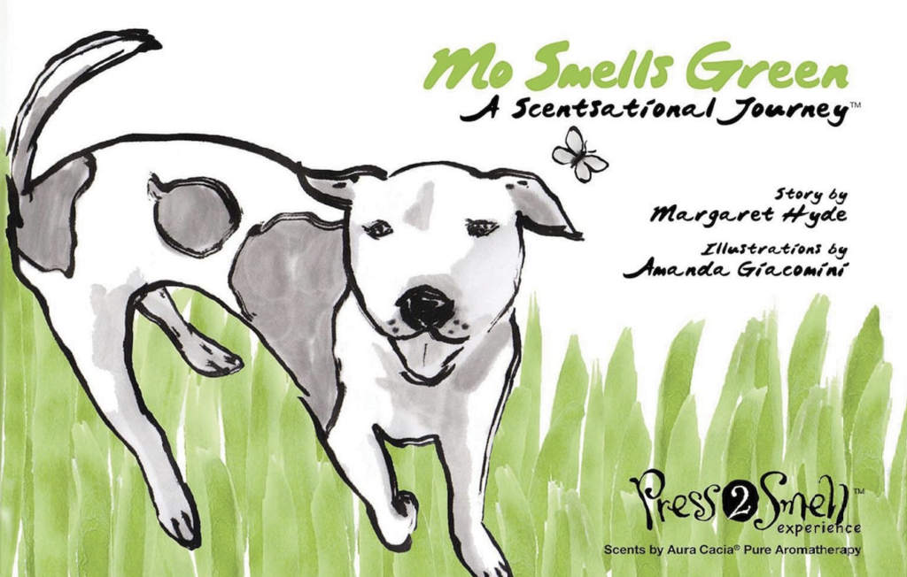 In the original books, I had him smelling all the colors of the rainbow. Then I started to research how to update scratch and sniff. I loved scratch and sniff; when my teacher would put those stickers on my homework, I loved it. They never quite smelled exactly how I wanted, and I realized that there must be a chemical component to it. I was trying to find a way to make it safe for kids and update it. too. We decided to use all essential oils because it’s aromatherapy. You might not like a scent but because it’s aromatherapy and 100% oil, you can’t be allergic to it and it’s not allergy-producing.